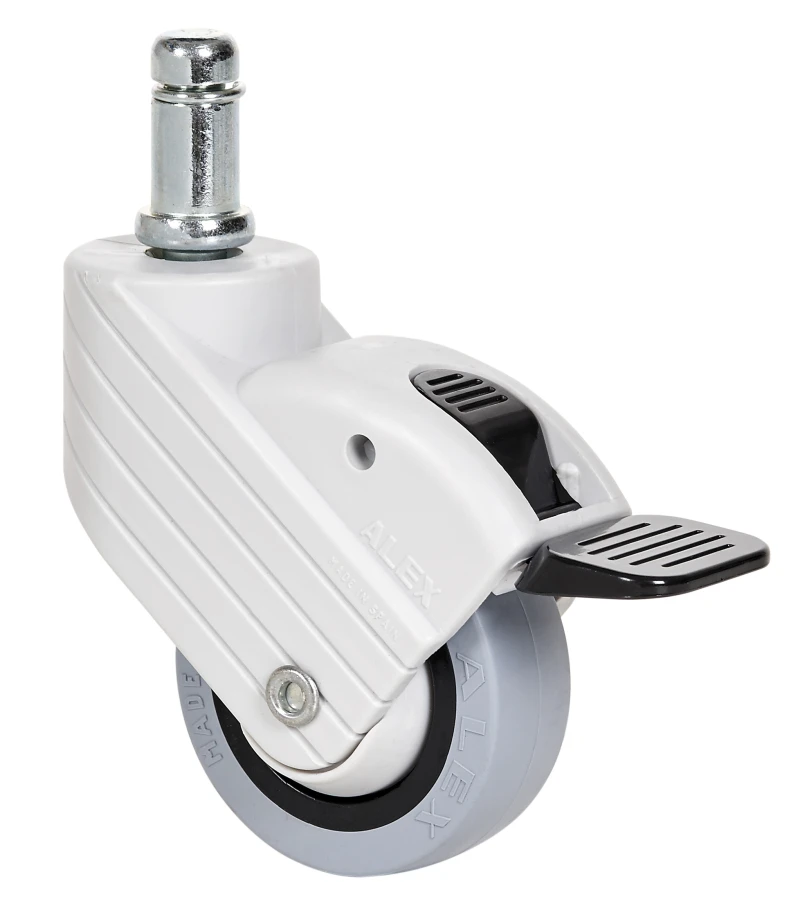 Made of heavy duty polyamide. Bracket with plate and threaded stem. Available with and without brake. Rounded ergonomic brake with flushed recess. Especially designed for the furniture and catering sectors. Optional bespoke colouring Manufactured to European Standard EN 12528