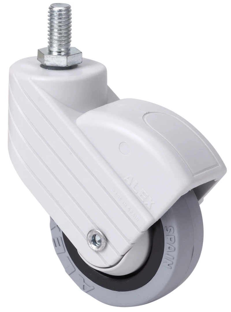 Made of heavy duty polyamide. Bracket with plate and threaded stem. Available with and without brake. Rounded ergonomic brake with flushed recess. Especially designed for the furniture and catering sectors. Optional bespoke colouring Manufactured to European Standard EN 12528