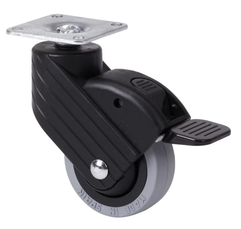 Made of heavy duty polyamide. Bracket with plate and threaded stem. Available with and without brake. Rounded ergonomic brake with flushed recess. Especially designed for the furniture and catering sectors. Optional bespoke colouring Manufactured to European Standard EN 12528