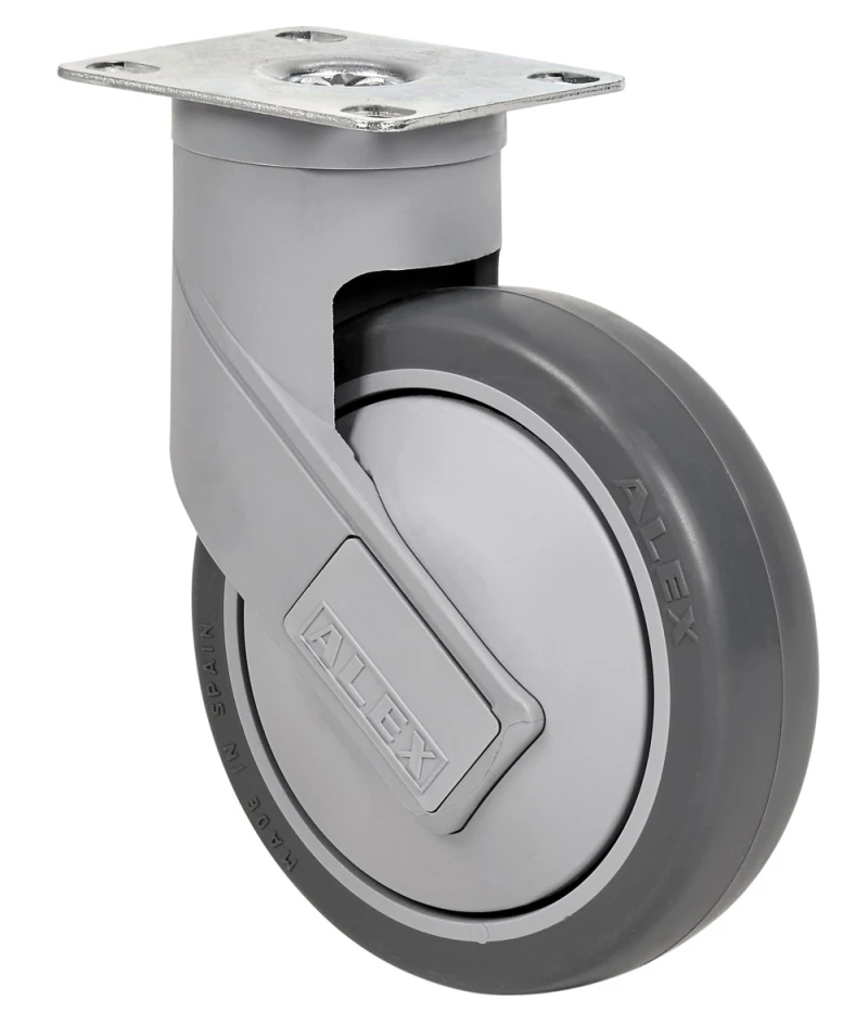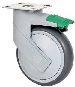 Our HC medium duty castors are recommended for medical equipment, institutional applications and for hotels and restaurants. Grey thermoplastic injected rubber wheel. Housing made of high quality polyamide reinforced with fibreglass. Upper swivel head with hardened double ball bearing (swivel plate and bolt hole) and embedded ball bearing (threaded pin). Especially designed to support loads up to 100 kg.