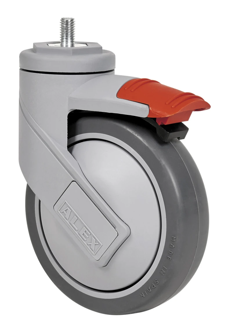 Our HC medium duty castors are recommended for medical equipment, institutional applications and for hotels and restaurants. Grey thermoplastic injected rubber wheel. Housing made of high quality polyamide reinforced with fibreglass. Upper swivel head with hardened double ball bearing (swivel plate and bolt hole) and embedded ball bearing (threaded pin). Especially designed to support loads up to 100 kg.