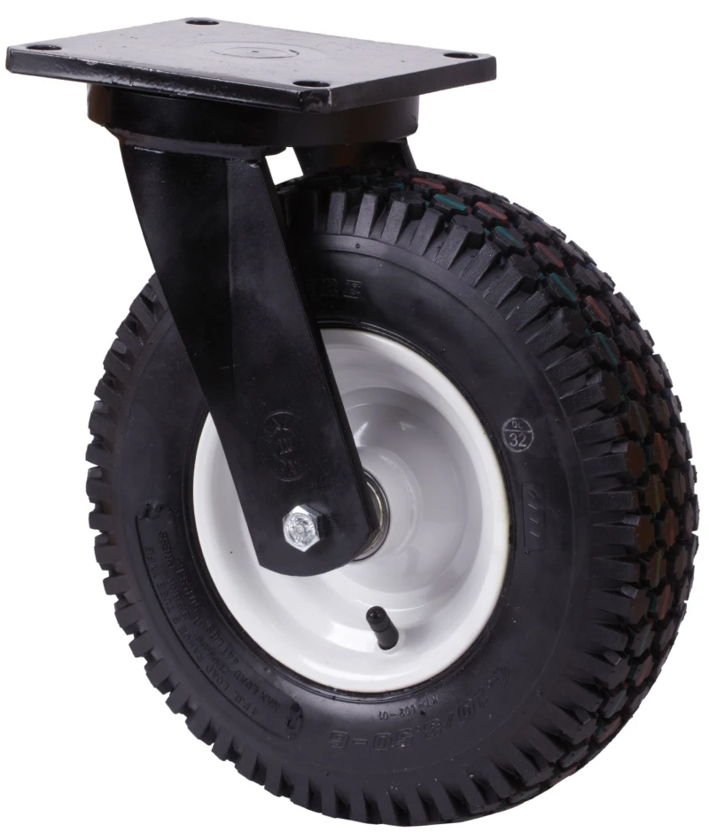 Black castors with metallic rim. Four and six-ply pneumatic tyre, especially indicated to support high-loads up to 300 Kg.