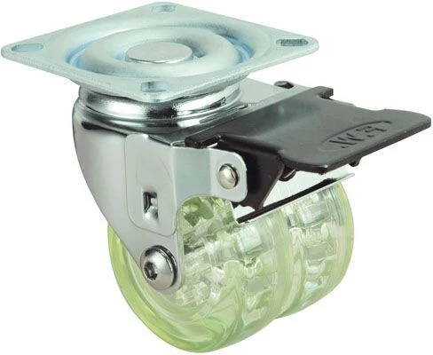 Material: Pressed steel.Finish: polished chrome.Fitting Type: Swivel plate.Double polyurethane-tyred, polycarbonate-centred wheel in transparent colours.Colours: blue or green. Available with break.