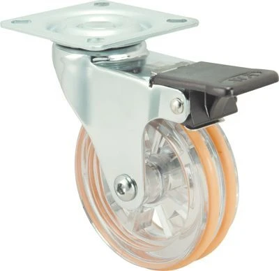 Material: Pressed steel. Finish: polished chrome. Fitting Type: Swivel plate.Polyurethane-tyre on transparent acrylic centre.Colours: Red, yellow, orange, green, blue, black. Available with break.