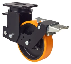 Castors with steel centre and black rubber tyre. Especially indicated to support high-loads up to 750 Kg. using a bracket with highly resistant spring loaded suspension to absorb impacts, collisions and uneven floors. Elastic behaviour of the spring up to 25mm, ideal in uneven surfaces due to its shock absorption. It is used in: logistics transport tools, outdoor areas, internal logistics, mobile platforms, elevating platforms, transport carts, logistics for military missions material, heavy machinery in the construction sector and mobile cranes. Mainly used in the aeronautic sector, railway and automobile factories.
