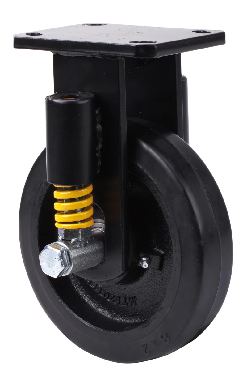 Castors with steel centre and black rubber tyre. Especially indicated to support high-loads up to 700 Kg. With highly resistant spring loaded suspension, ideal in uneven surfaces due to its shock absorption.