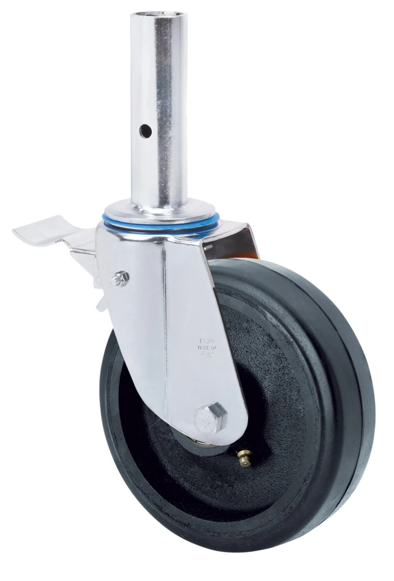 Made of pressed steel up to 4 mm.Finish: passivated zinc.Adjustable total brake.High load capacity.Recommended for scaff olding up to 4 metres and stable floors.Manufactured to European standard EN 12532.