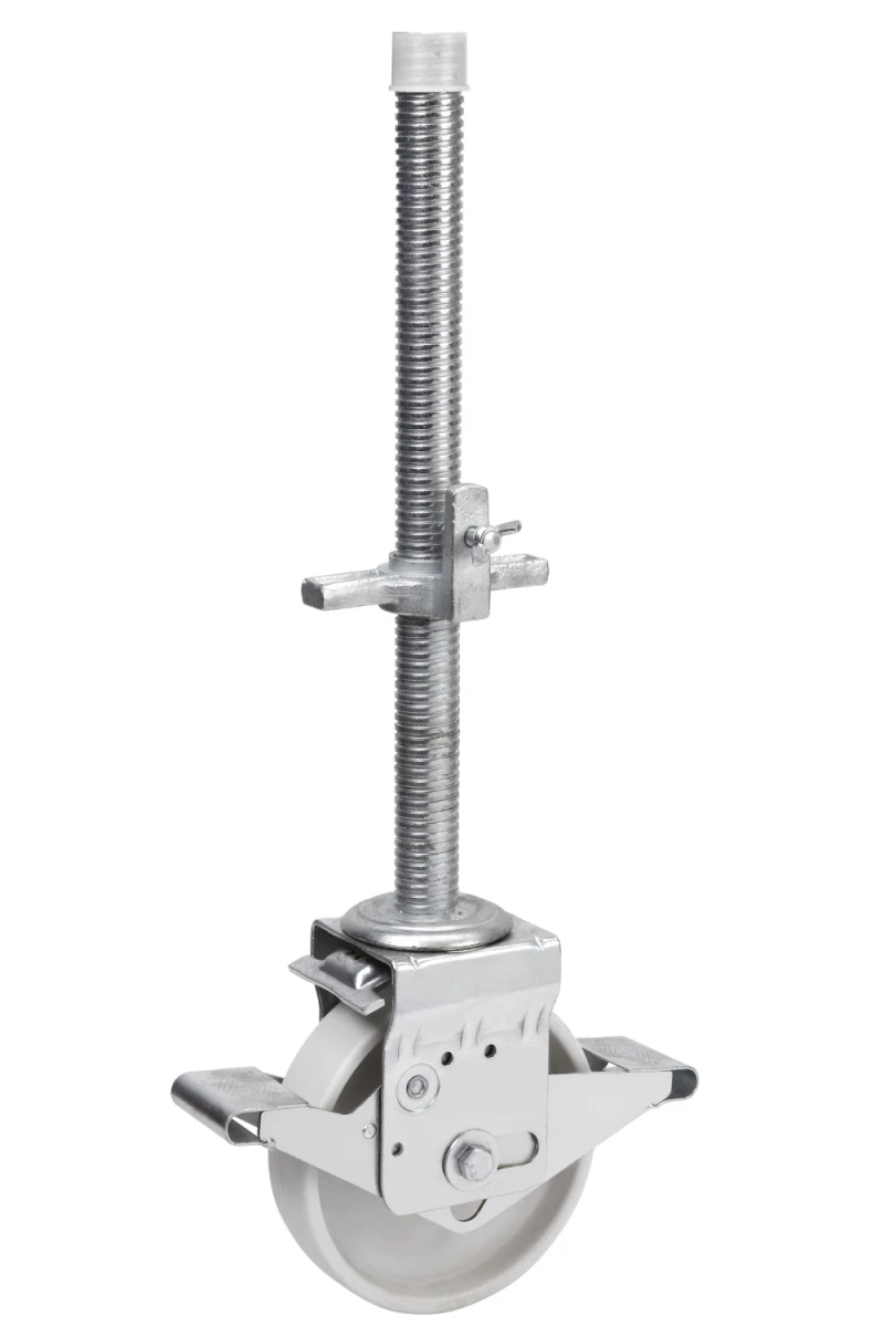 Made of pressed steel up to 4 mm. Finish: passivated zinc. Adjustable total brake. High load capacity. Recommended for scaff olding up to 4 metres and stable floors. Manufactured to European standard EN 12532.
