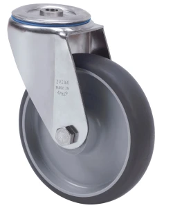 Grey injected rubber castors with stainless steel (AISI 304) components. Especially indicated to support high-loads up to 180 Kg.