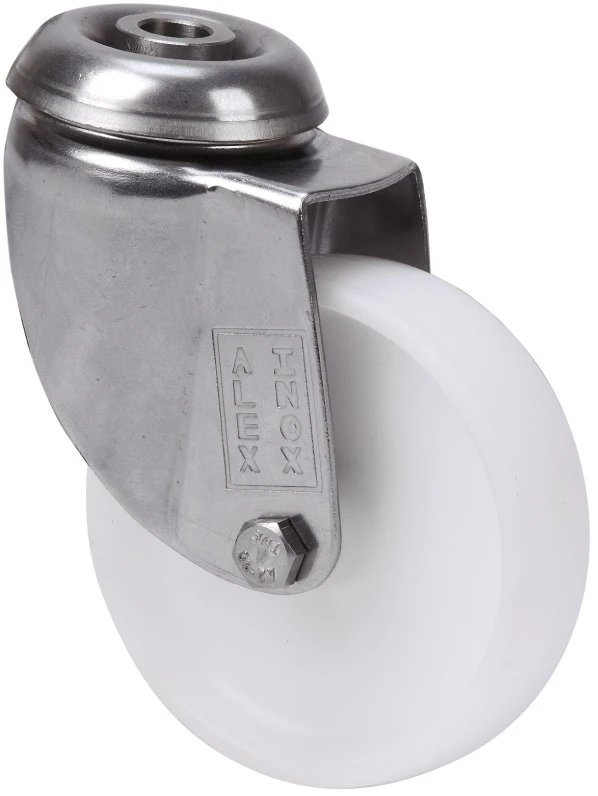 White polypropylene castors with stainless steel (AISI 304) components. Especially indicated to support high-loads up to 80 Kg.