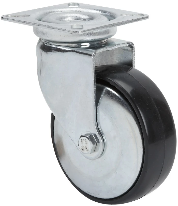 Pressed steel bracket.Finish: glossy zinc plating.Fitting: plate and bolt hole.Double ball bearing.Wheel Bearings: Plain bearing.Avalaible with threadguards.