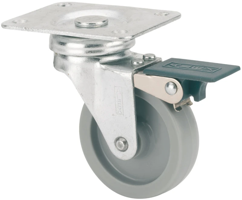 Made of pressed steel castor up to 2 mm. Finish: Zinc-plated.One single ball bearing swivel head.Rubber wheels Ø 50 and 60 mm with threadguards.Manufactured to European standards EN 12528.