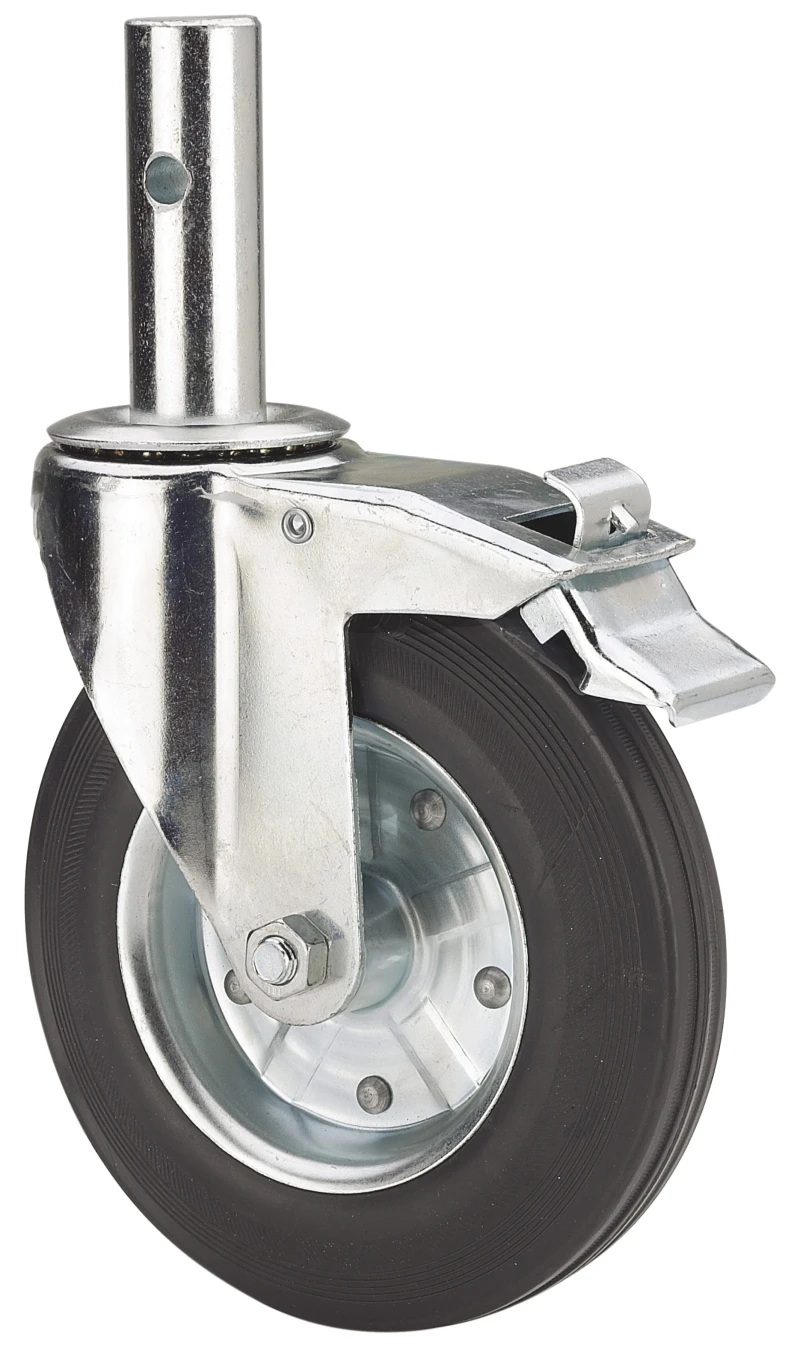 Pressed steel bracket. Finish: glossy zinc plating.Plug-in pin and solid stem fitting for scaffolding.Standard system.Double ball bearing.Wheel Bearings: roller bearing.