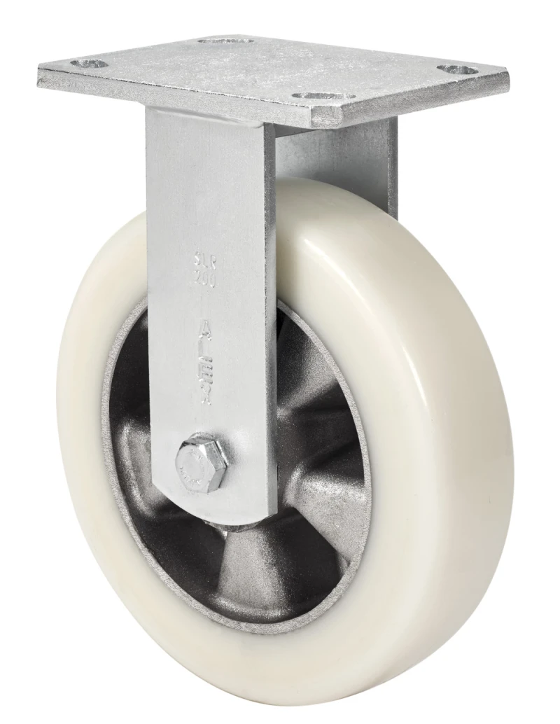 Castors with aluminium centre and white cast poluyrethane tyre with a hardness of 88º Shore A, especially indicated to support high-loads up to 650 Kg.