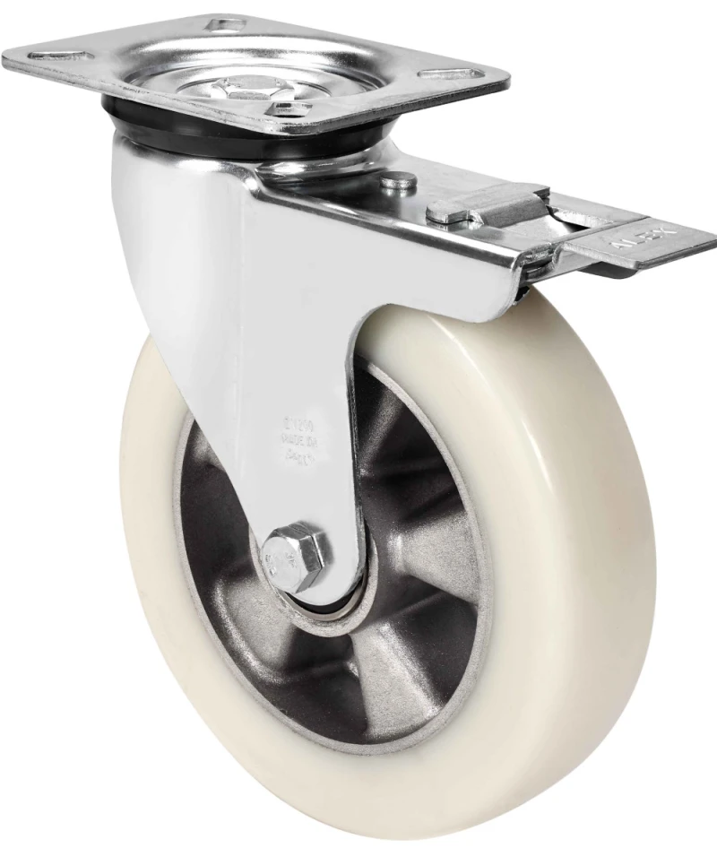 Castors with aluminium centre and white cast poluyrethane tyre with a hardness of 88º Shore A, especially indicated to support high-loads up to 650 Kg.