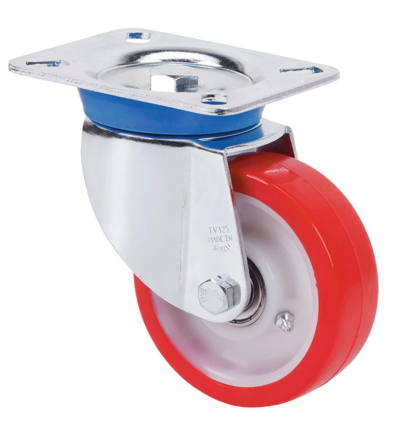 Castors with white nylon centre and red polyurethane tyre with a hardness of 90º-95º Shore A. Especially indicated to support high-loads up to 600 Kg.