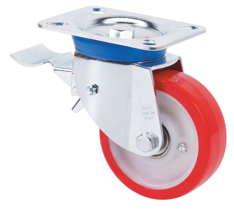 Castors with white nylon centre and red polyurethane tyre with a hardness of 90º-95º Shore A. Especially indicated to support high-loads up to 600 Kg.