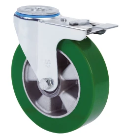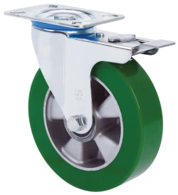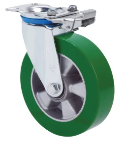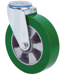 Castors with aluminium centre and green polyurethane tyre with a hardness of 80º Shore A. Especially indicated to support high-loads up to 400 Kg.