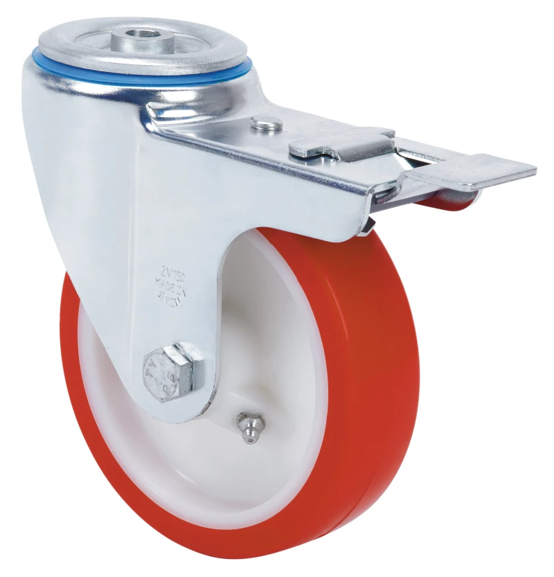 Castors with white nylon centre and red injected polyurethane tyre with a hardness of 90-95º Shore A. Especially indicated to support high-loads up to 400 Kg.