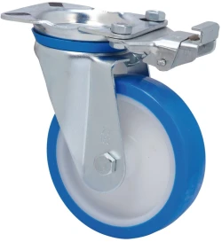 Castors with white polypropylene centre and soft blue injected polyurethane tyre with a hardness of 80º Shore A. Especially indicated to support high-loads up to 250 Kg.