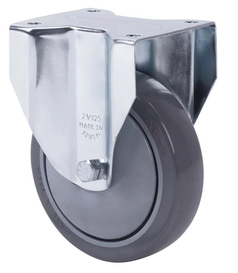 Castors with polypropylene centre and grey injected polyurethane tyre. Especially used to support high-loads up to 200 Kg.