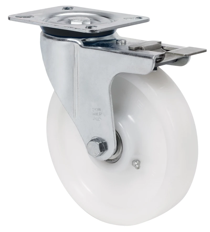 FT: castors especially indicated for food and chemical industry applications. Does not leave marks on floor. Reinforced. High resistance to impacts and collisions.