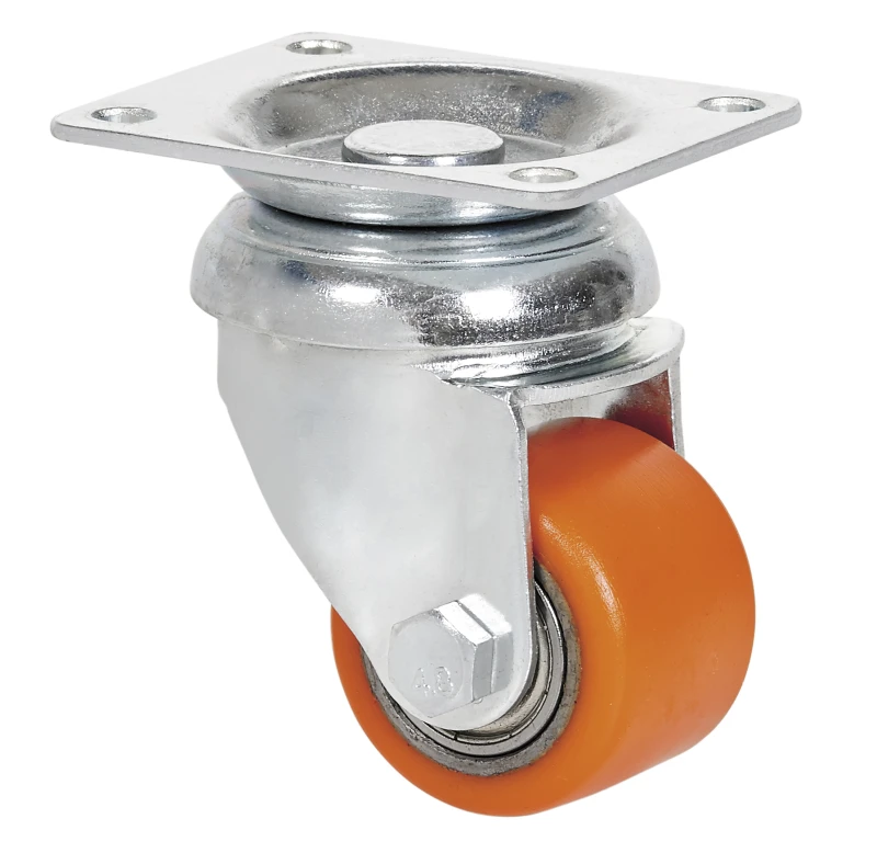 Castors with steel centre wheel and cast polyurethane tread (95º Shore A hardness). Especially designed to support loads up to 100 kg with minimal height.