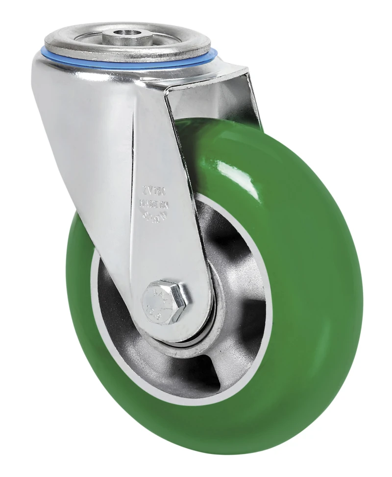 AUAGB Wheel: High load capacity green polyurethane with round tread. Less turning resistance and easier rolling thanks to its convex shape.