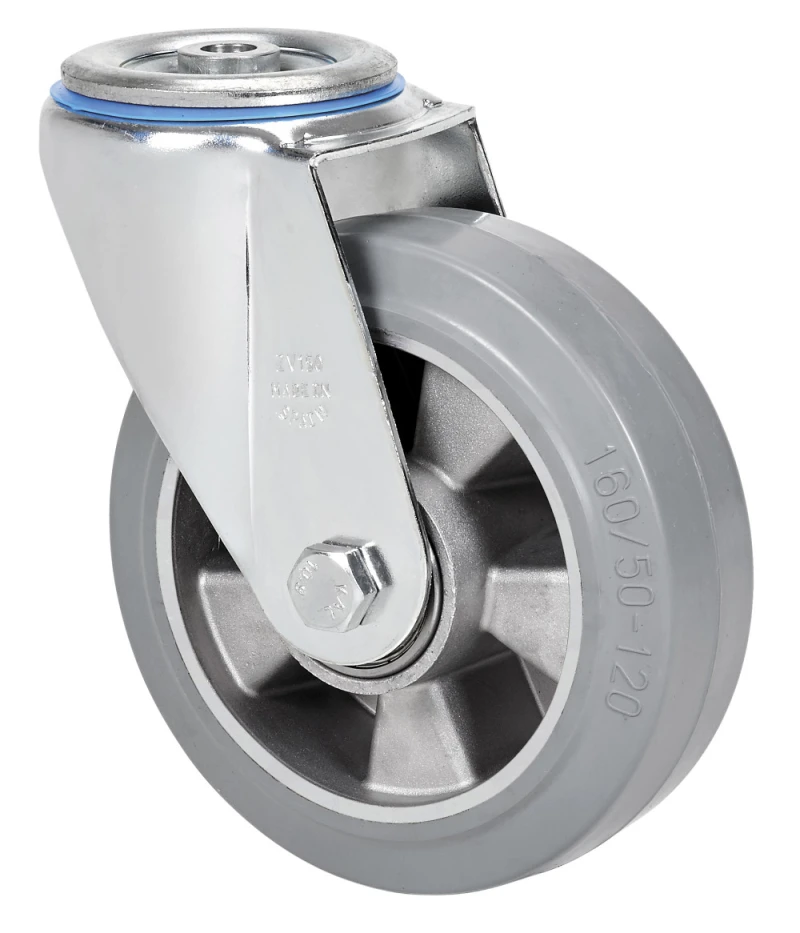 Grey elastic rubber tyre (70º Shore A hardness) on aluminium centre. Especially designed to support heavy loads up to 450 Kg.