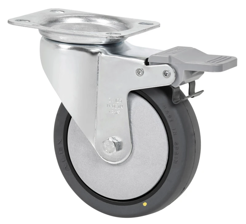 ZV-PGC Heavy-medium duty castors with grey electrically conductive polyurethane wheels. Used in hospitals, operating rooms and food factories. Antistatic wheels with polypropylene centre and grey injected polyurethane tread. Especially designed to support loads up to 200 kg.
