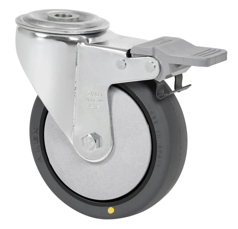 ZV-PGC Heavy-medium duty castors with grey electrically conductive polyurethane wheels. Used in hospitals, operating rooms and food factories. Antistatic wheels with polypropylene centre and grey injected polyurethane tread. Especially designed to support loads up to 200 kg.