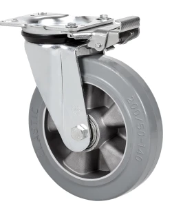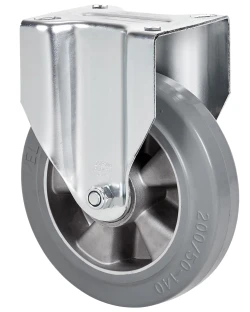 Grey elastic rubber tyre (70º Shore A hardness) on aluminium centre. Especially designed to support heavy loads up to 450 Kg.